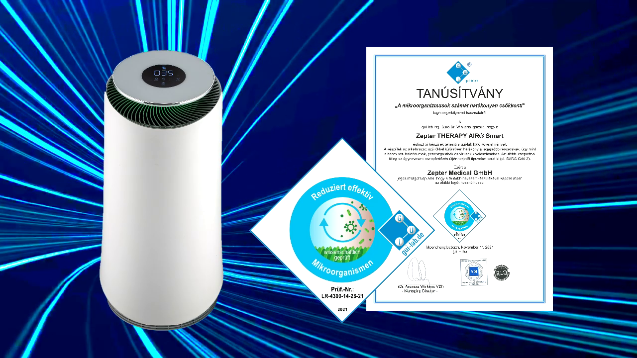 A gui-lab tanúsítványa igazolja, hogy a TherapyAir® Smart a benne alkalmazott szűrőkkel különösen hatékony a legapróbb részecskék, úgy, mint a finom por, baktériumok, penészgombák és vírusok kiválasztásában. Az utóbbi csoportnál főleg az úgynevezett cseppfertőzés útján terjedő típusokat szűri ki, mint például a SARS-CoV-2 koronavírus.