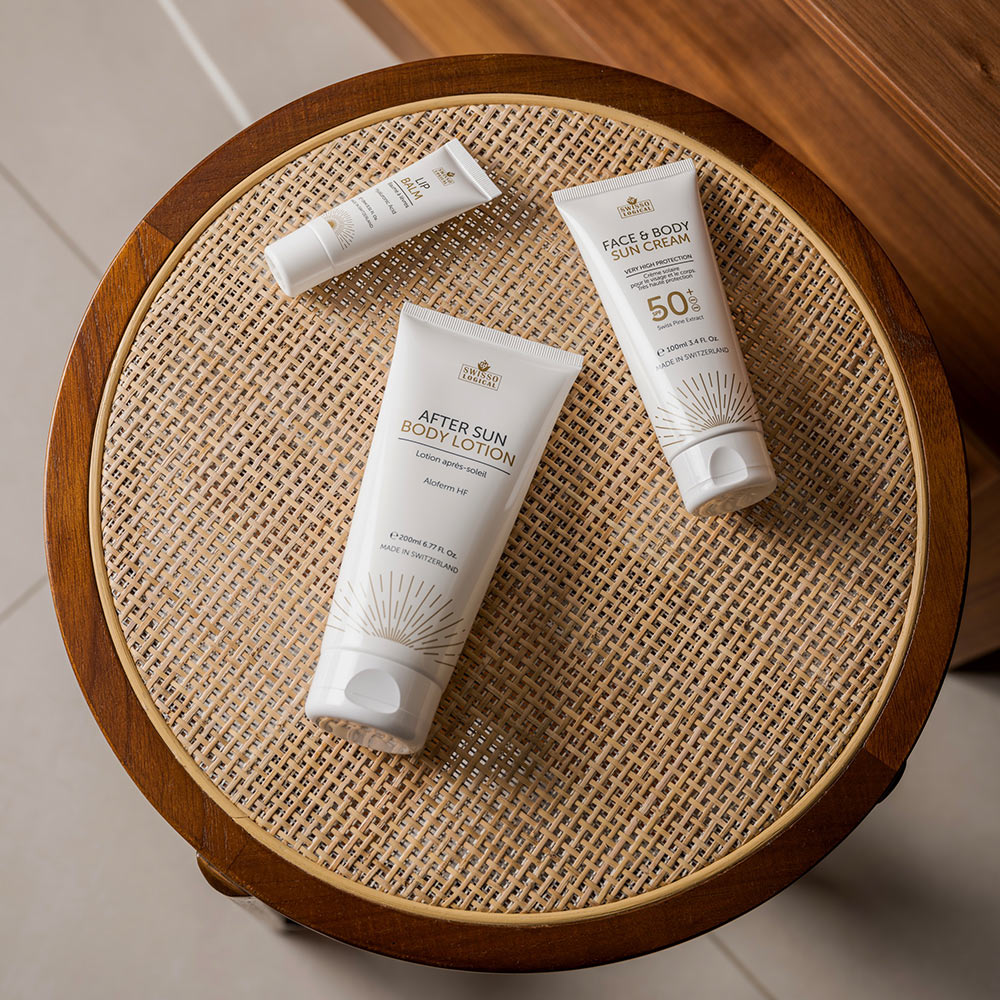 - SPF 50+ naptej testre és arcra – nagy teljesítményű formula, amely pinoluminnal és antileukine 6-tal gazdagított. Védi a bőrt a fénykárosodástól és az öregedés jeleitől, miközben megőrzi annak feszességét és rugalmasságát.